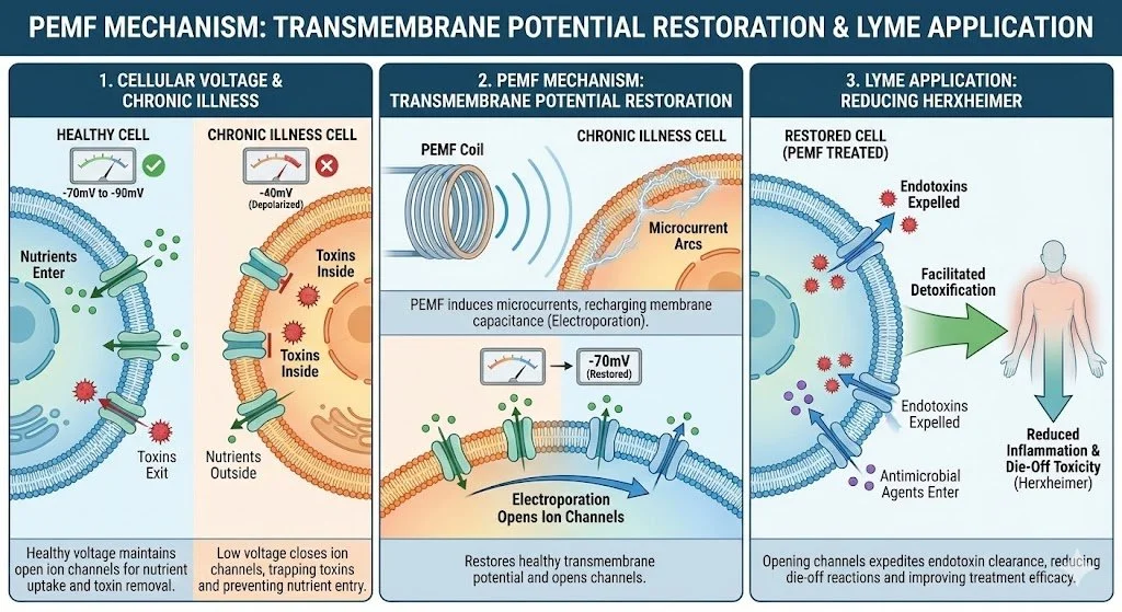 Lyme Application: By opening ion channels, PEMF reduces the "Herxheimer" reaction (die-off toxicity) by facilitating the expulsion of endotoxins. It physically prepares the cell to receive the antimicrobial agents discussed previously