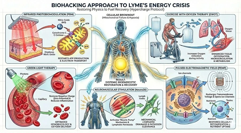 This review argues for a fundamental paradigm shift toward a "Physics-First" hierarchy of care. By prioritizing advanced biophysical modalities—specifically Photobiomodulation (Systemic, Green Light, and Transcranial), Hyperbaric Oxygen Therapy (HBOT), Pulsed Electromagnetic Field (PEMF) therapy, Neuromuscular Electrical Stimulation (NMES), and Transcranial Magnetic Stimulation (TMS)—clinicians can address the structural, energetic, and neurological pathologies of Lyme that chemical agents cannot reach. We propose that restoring cellular voltage, oxygen tension, glymphatic drainage, and cortical network stability is the essential prerequisite for biochemical interventions to be effective.