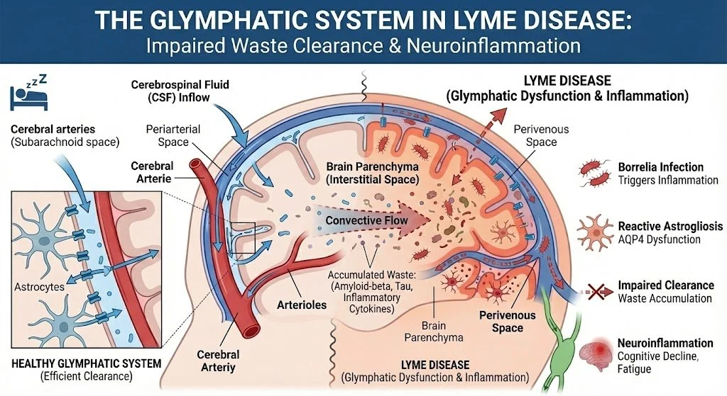 Lyme neuroborreliosis causes a "cerebral energy crisis." The brain is the most energy-demanding organ, and mitochondrial failure here manifests as "brain fog." However, energy is only half the equation; waste clearance is the other.