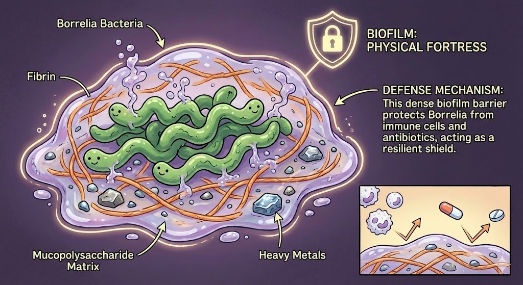 Perhaps the most significant barrier to biochemical treatments is the biofilm. Borrelia secretes a mucopolysaccharide matrix sequestered with fibrin and heavy metals. This biofilm acts as a physical fortress.