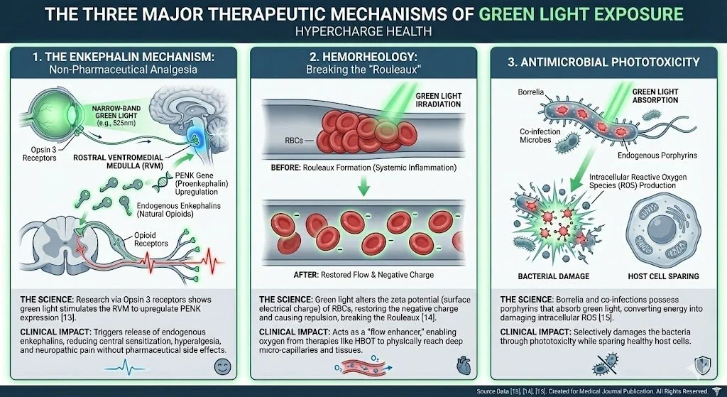 While Red/NIR wavelengths address the mitochondrial "engine," a comprehensive biophysical protocol must also address the "wiring" (pain processing) and the "fuel lines" (blood viscosity). Emerging research identifies Green Light (520–535nm) as a critical, distinct component of the Lyme biohacking arsenal.