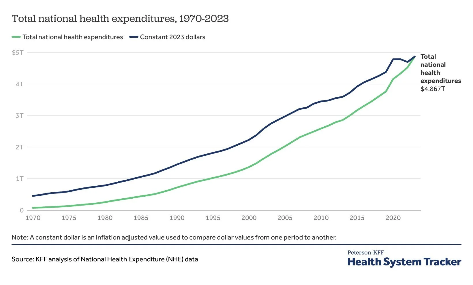 National health expenditures reached $4.867 trillion in 2023, up from $74.1 billion in 1970 when adjusted for inflation [7]. This growth—fueled by hospital care (31%), physician services (20%), and drugs (8%)—highlights a system prioritizing treatment over prevention [28].