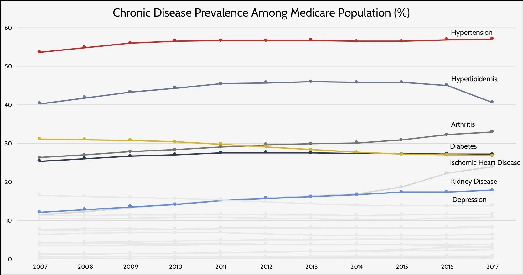 Despite trillions invested, chronic diseases afflict 60% of Americans, with 40% managing multiple conditions [8][22]. Obesity affects 42% of adults, hypertension 31.6%, diabetes 12.5%, and asthma 11%, with Alzheimer's costs hitting $360 billion in 2024 after deaths doubled since 2000 [23]. Projections warn of heart disease and stroke expenses reaching $2 trillion by 2050 [23]. Among the Medicare population, prevalence has steadily increased: hypertension rose from 55% in 2007 to 58% in 2017, diabetes from 28% to 31%, and kidney disease from 14% to 19% [24].