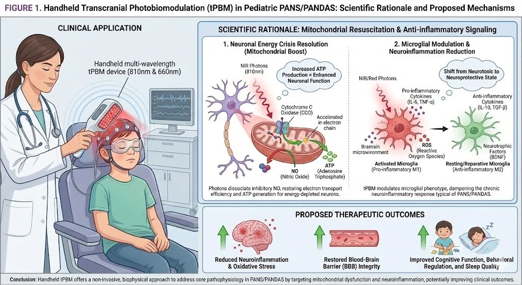 Mechanism: NIR light (810nm) stimulates Cytochrome C Oxidase, restarting the electron transport chain (ATP surge) and shifting microglia from a destructive (M1) to a reparative (M2) state. Safety: tPBM has a remarkable safety profile in pediatric studies, with no thermal tissue damage or serious adverse events reported [9].
